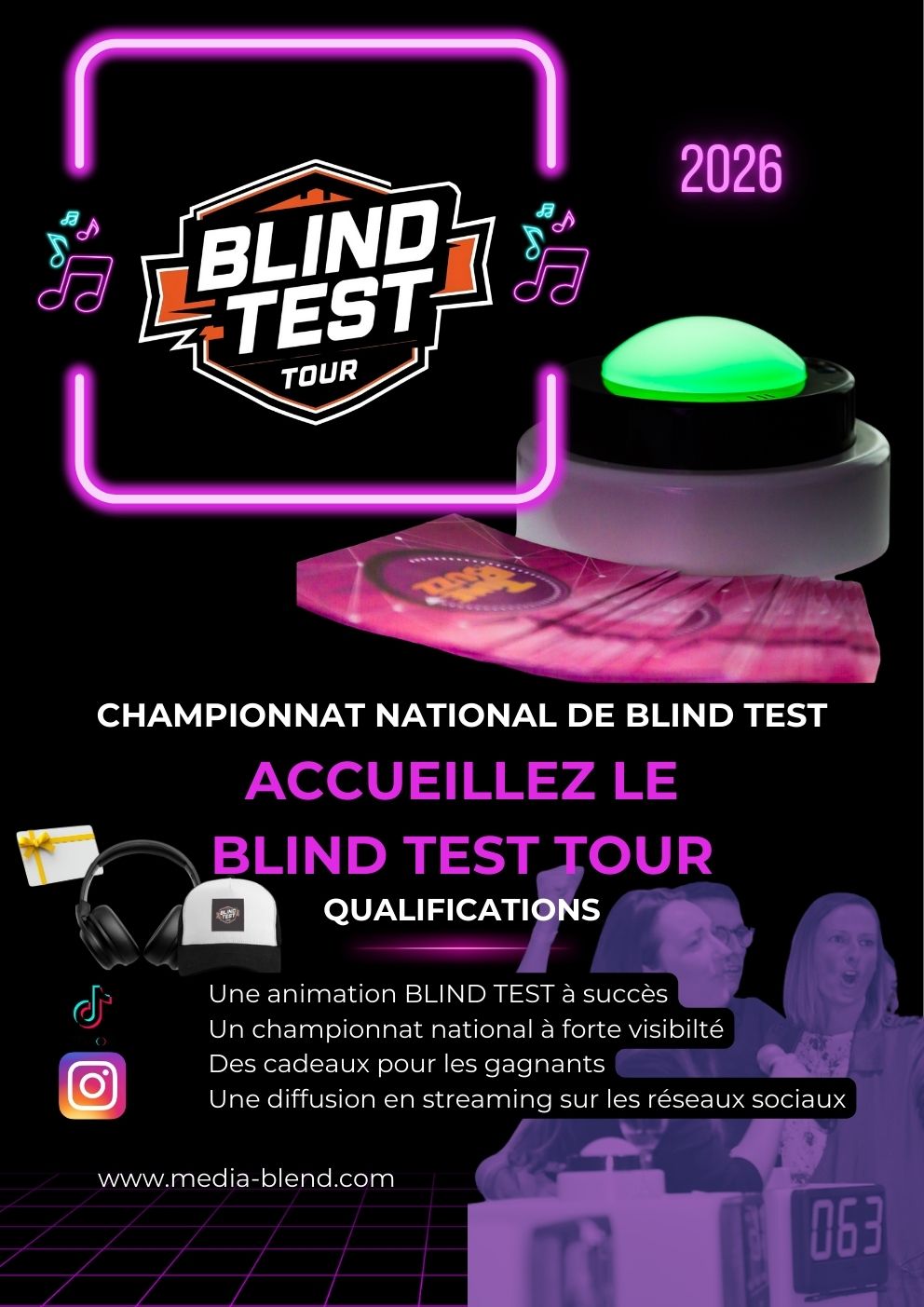 Le Blind Test Tour est un championnat national de blind test musical qui parcourt toute la France à travers une série de phases qualificatives organisées dans des lieux variés et accessibles au grand public.